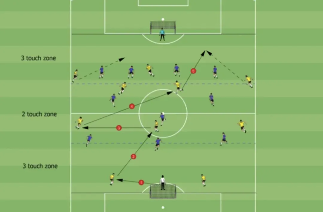 本训练通过严格的触球次数限制,在模拟真实比赛的高压环境下,系统性提升球队的战术执行力。它强制要求球员进行快速思考、精准传递和无球跑动,核心在于 “效率”与“节奏”。
