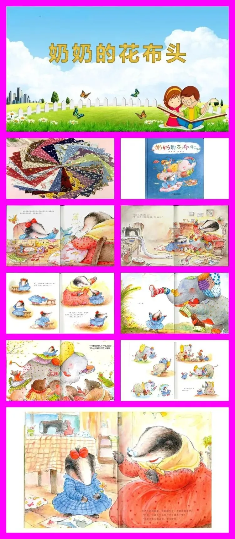 2.教师小结:“这些花布头可神奇啦,有一位奶奶,她有好多好多花布头,能用这些花布头做出各种各样漂亮又有趣的玩意儿,她的孙女米丽可喜欢了。今天我们就一起来听听奶奶和花布头的故事吧!”引出故事名称《奶奶的花布头》,带领幼儿齐读。