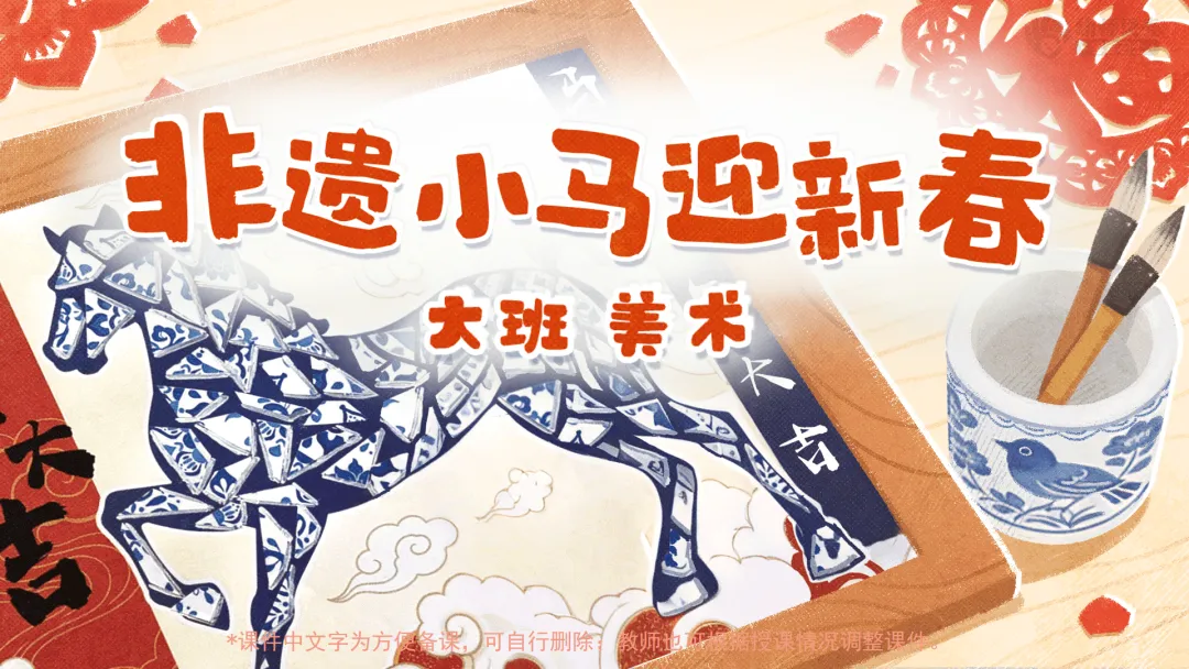 l认识并欣赏漆画、剪纸、青花瓷等常见非遗项目,融合马年生肖传递新春美好祝福。