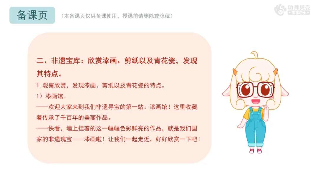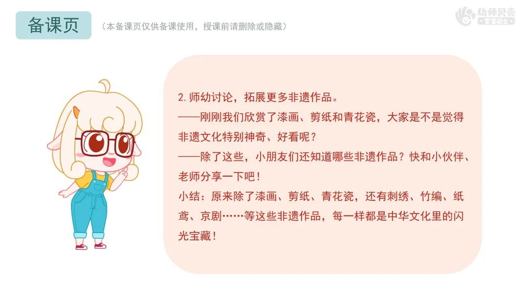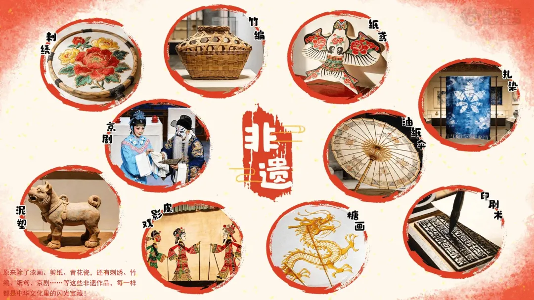 ——除了这些,小朋友们还知道哪些非遗作品?快和小伙伴、老师分享一下吧! 小结:原来除了漆画、剪纸、青花瓷,还有刺绣、竹编、纸鸢、京剧等这些非遗作品,每一样都是中华文化里的闪光宝藏!