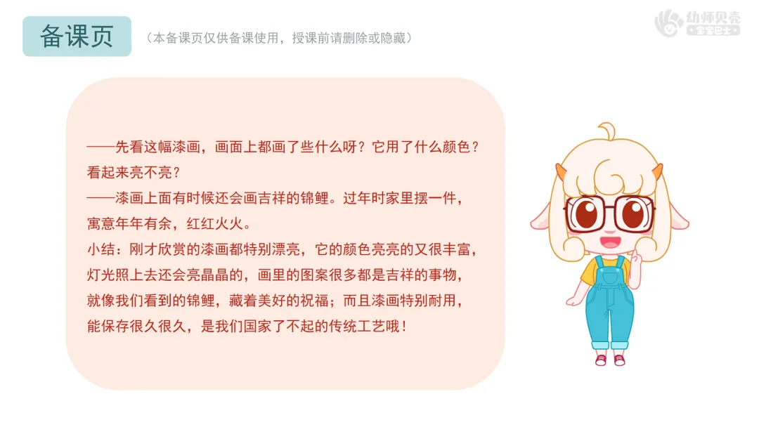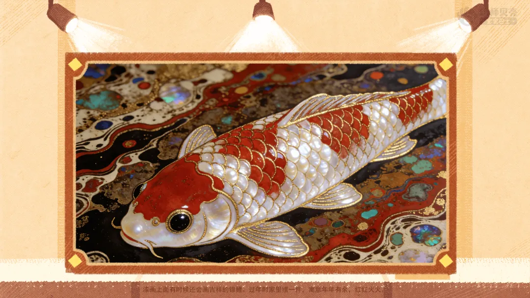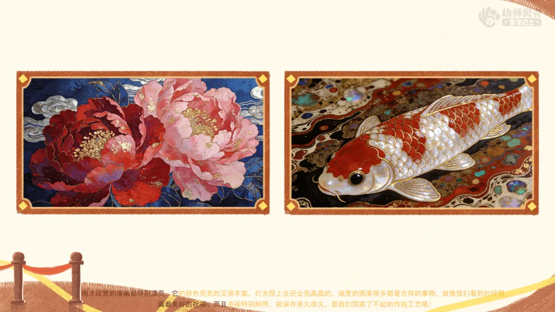 小结:刚才欣赏的漆画都特别漂亮,它的颜色亮亮的又很丰富,灯光照上去还会亮晶晶的,画里的图案很多都是吉祥的事物,就像我们看到的锦鲤,藏着美好的祝福;而且漆画特别耐用,能保存很久很久,是我们国家了不起的传统工艺哦!