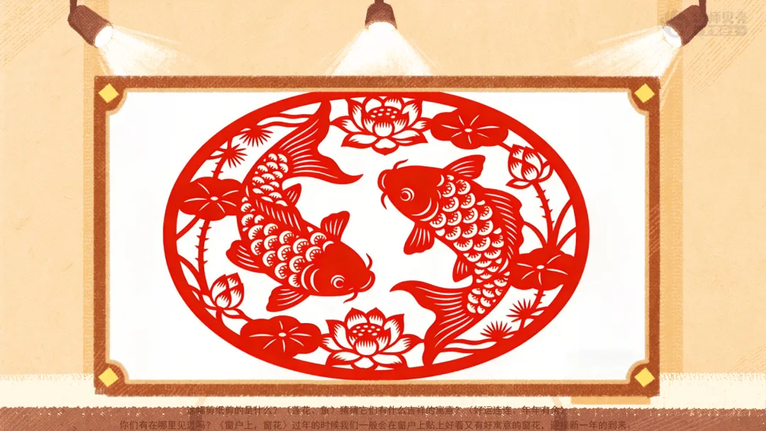 ——这幅剪纸剪的是什么?(莲花、鱼)猜猜它们有什么吉祥的寓意?(好运连连、年年有余)