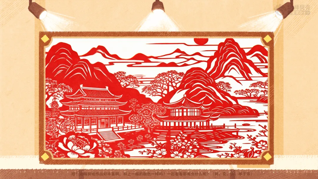 ——你们有在哪里见过吗?(窗户上,窗花)过年的时候我们一般会在窗户上贴上好看又有好寓意的窗花,迎接新一年的到来。 ——哇!这幅剪纸作品好丰富啊,和上一幅的颜色一样吗?一起看看都有些什么呢?(树、花、山、亭子等)