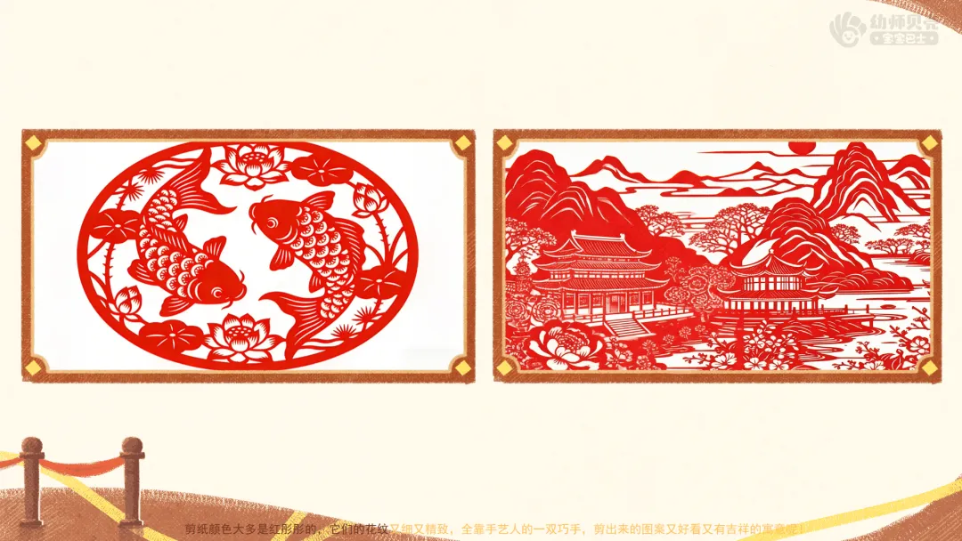 小结:剪纸颜色大多是红彤彤的,它们的花纹又细又精致,全靠手艺人的一双巧手,剪出来的图案又好看又有吉祥的寓意呢!
