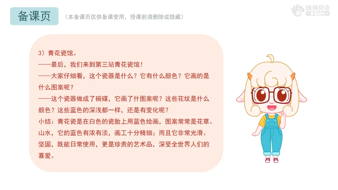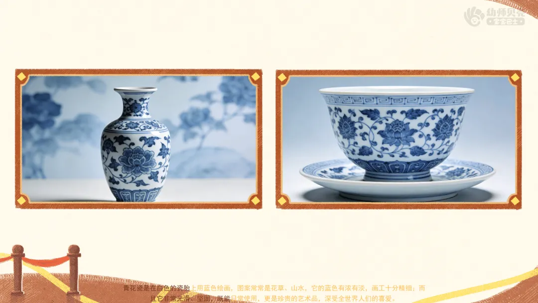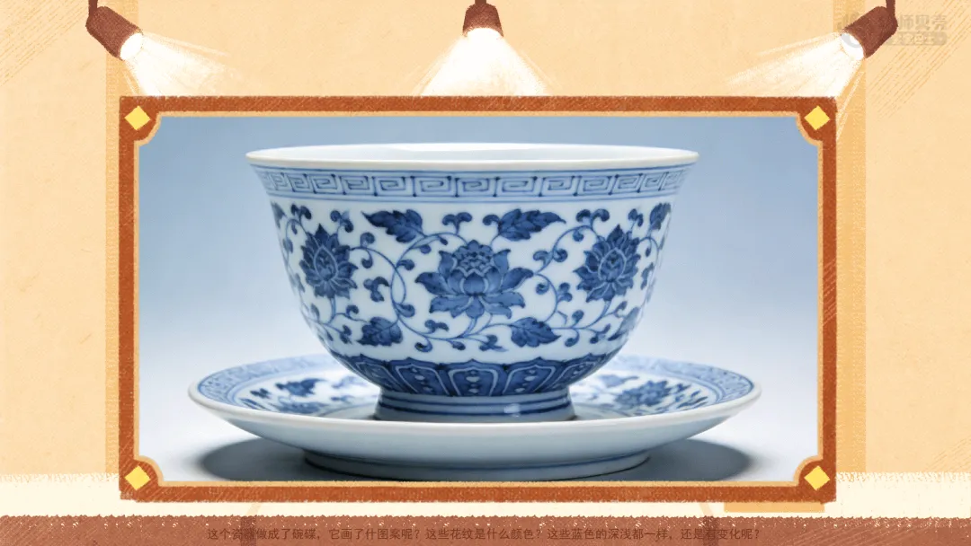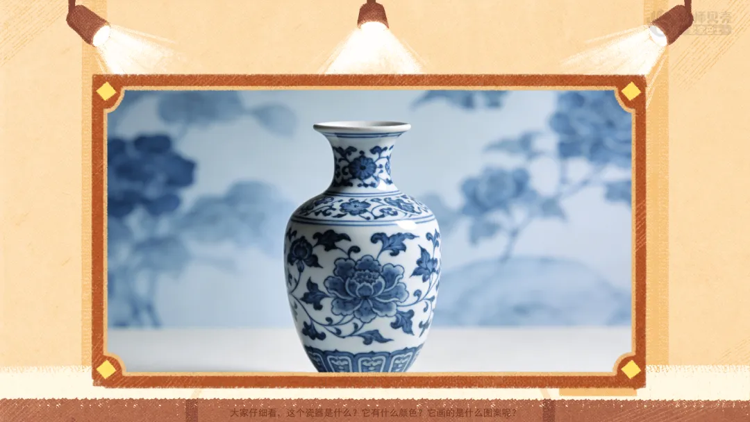 ——大家仔细看,这个瓷器是什么?它有什么颜色?它画的是什么图案呢?