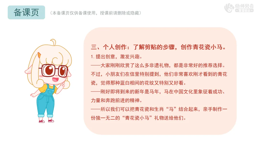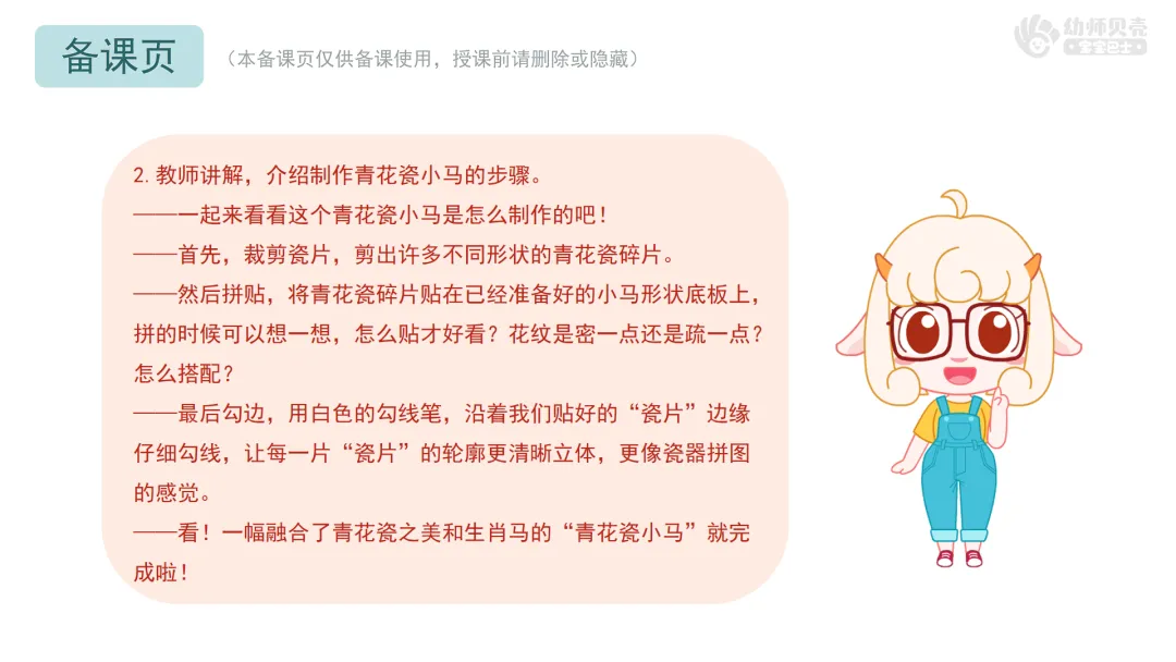 2.教师讲解,介绍制作青花瓷小马的步骤。 ——一起来看看这个青花瓷小马是怎么制作的吧!