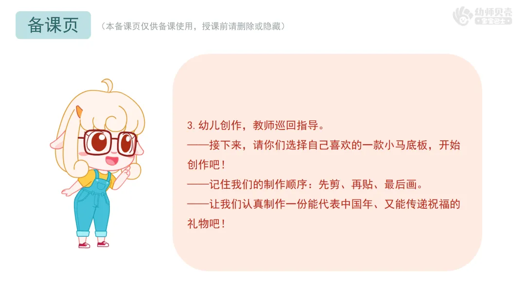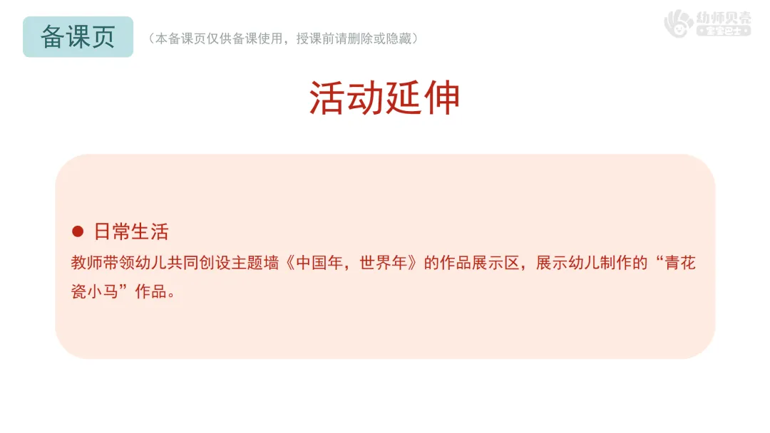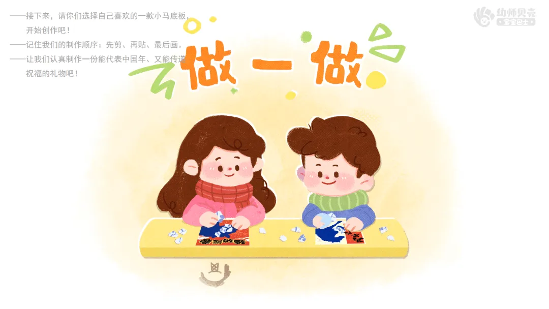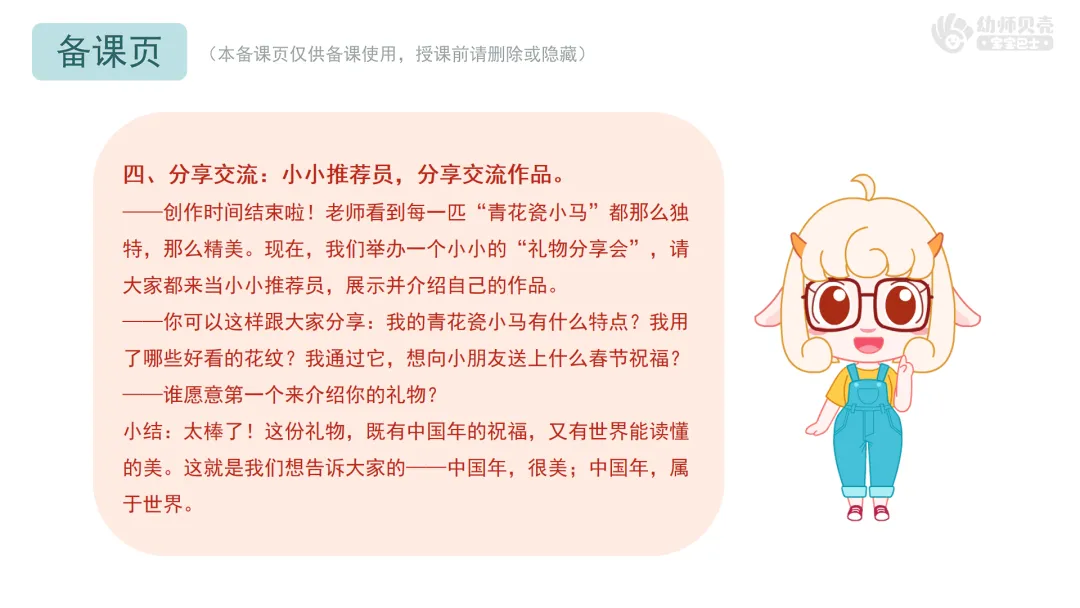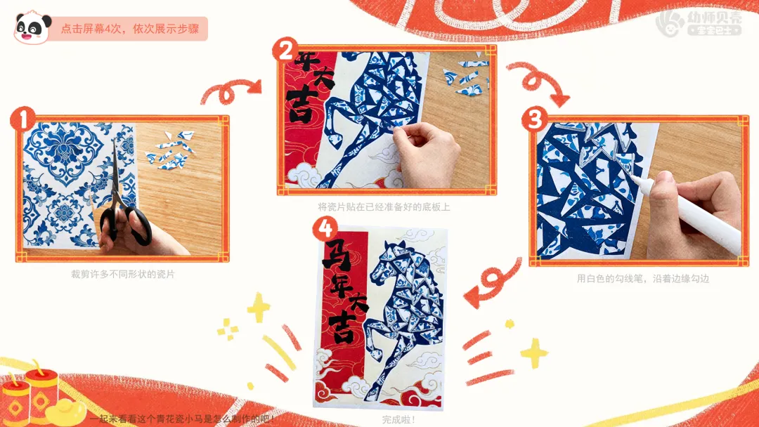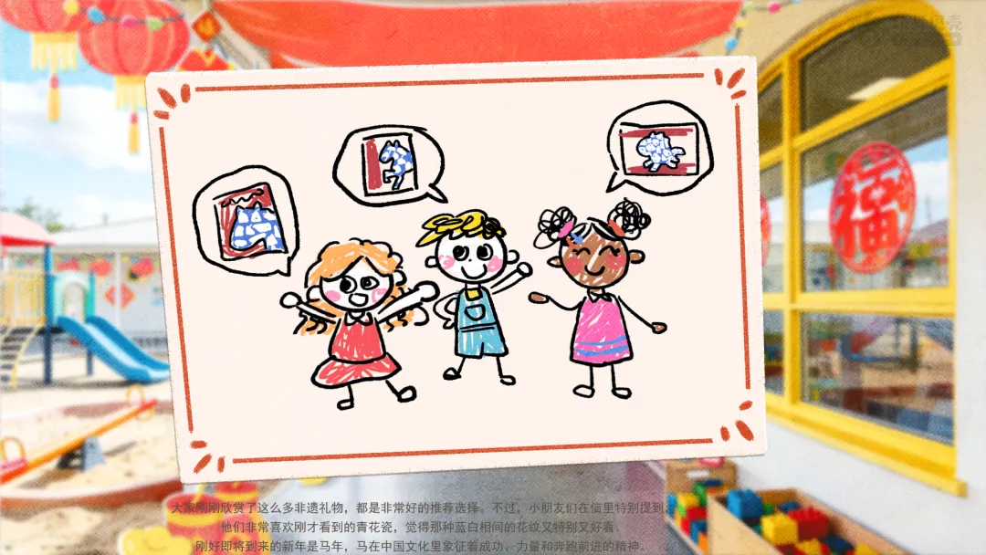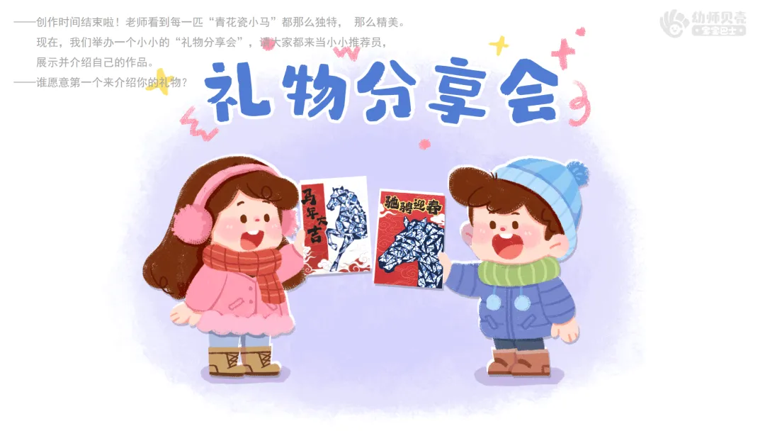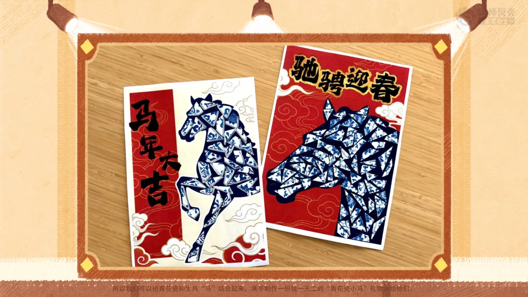 ——你可以这样跟大家分享:我的青花瓷小马有什么特点?我用了哪些好看的花纹?我通过它,想向小朋友送上什么春节祝福?