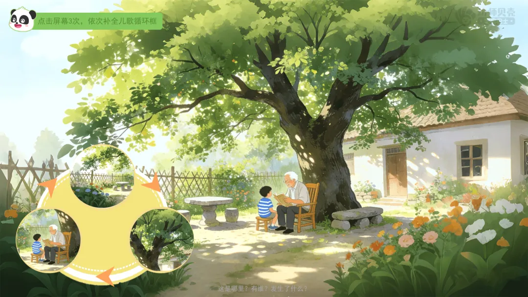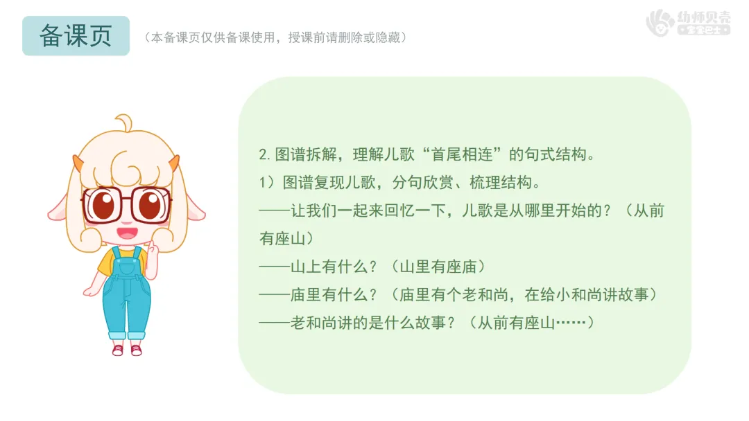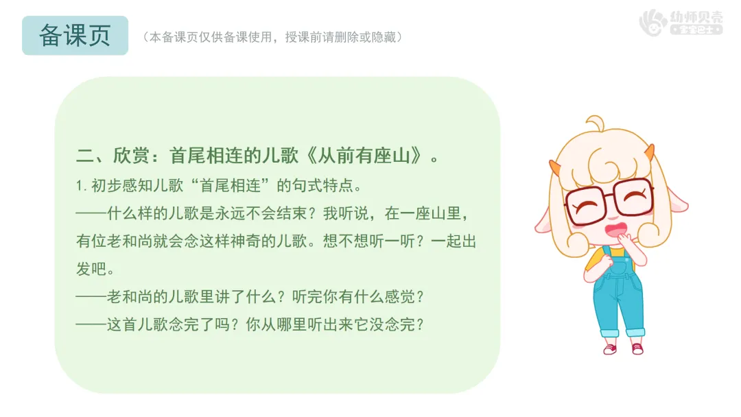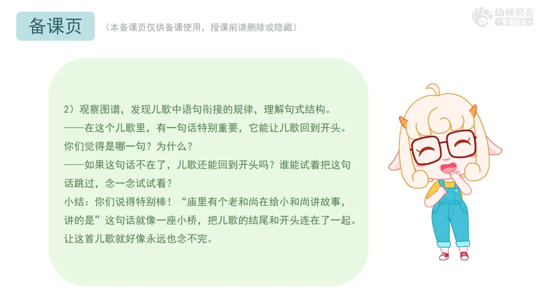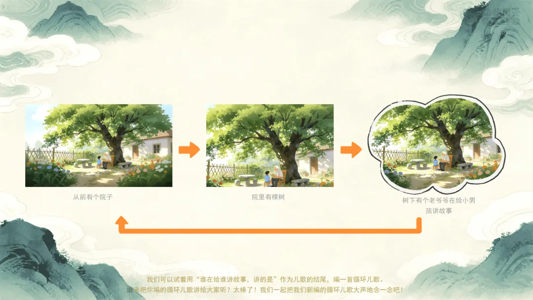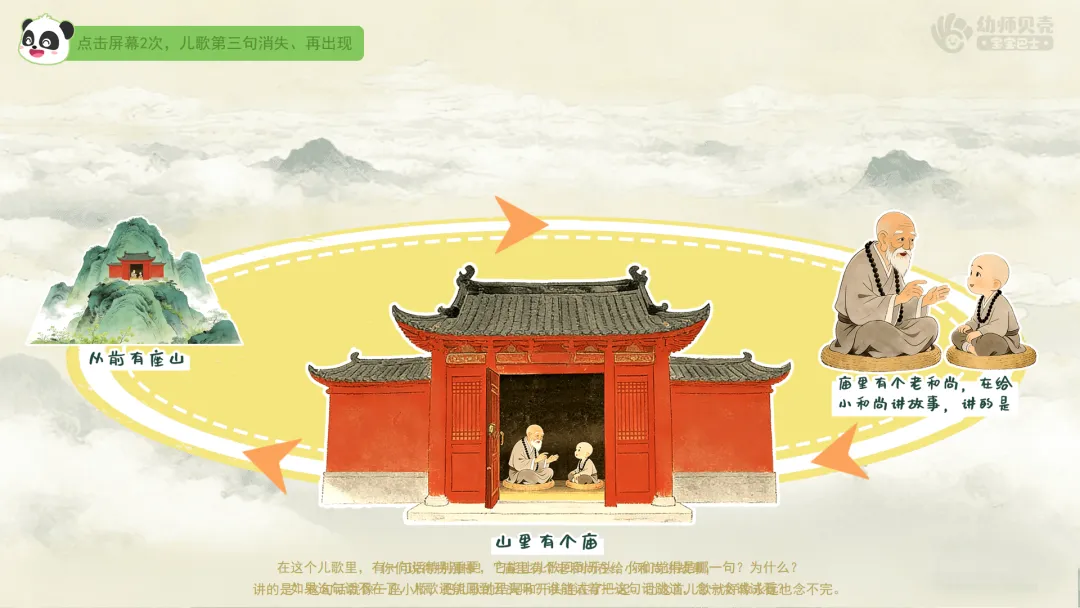 小结:你们说得特别棒!“庙里有个老和尚在给小和尚讲故事,讲的是”这句话就像一座小桥,把儿歌的结尾和开头连在了一起。让这首儿歌就好像永远也念不完。