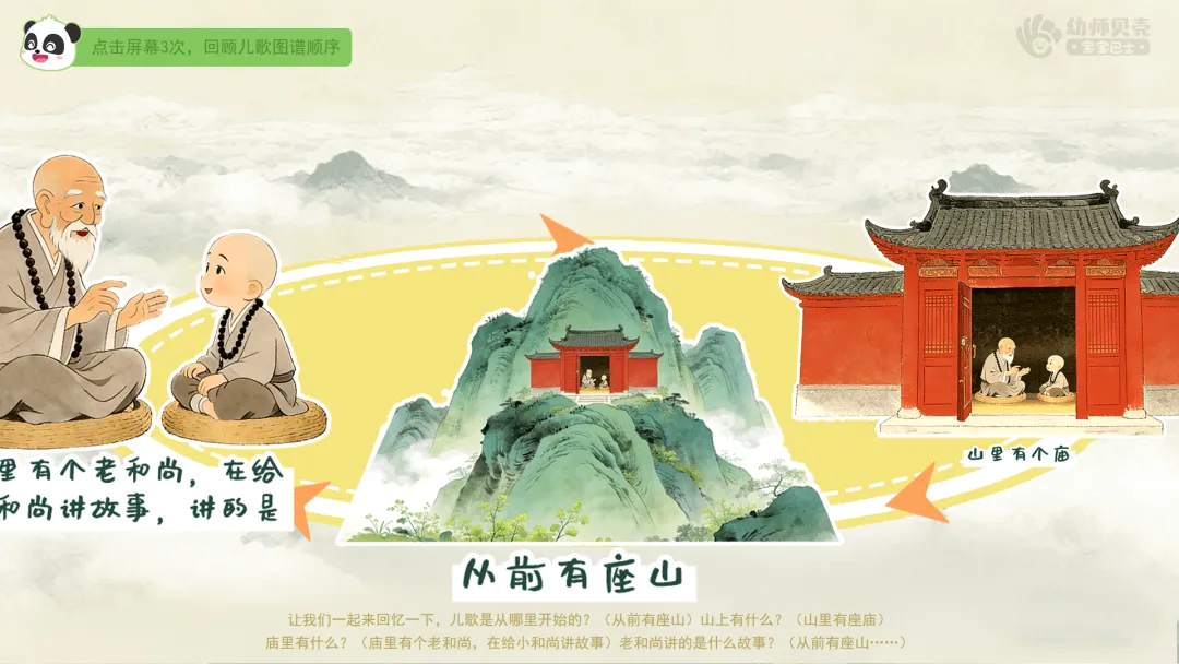 ——让我们一起来回忆一下,儿歌是从哪里开始的?(从前有座山) ——山上有什么?(山里有座庙)
