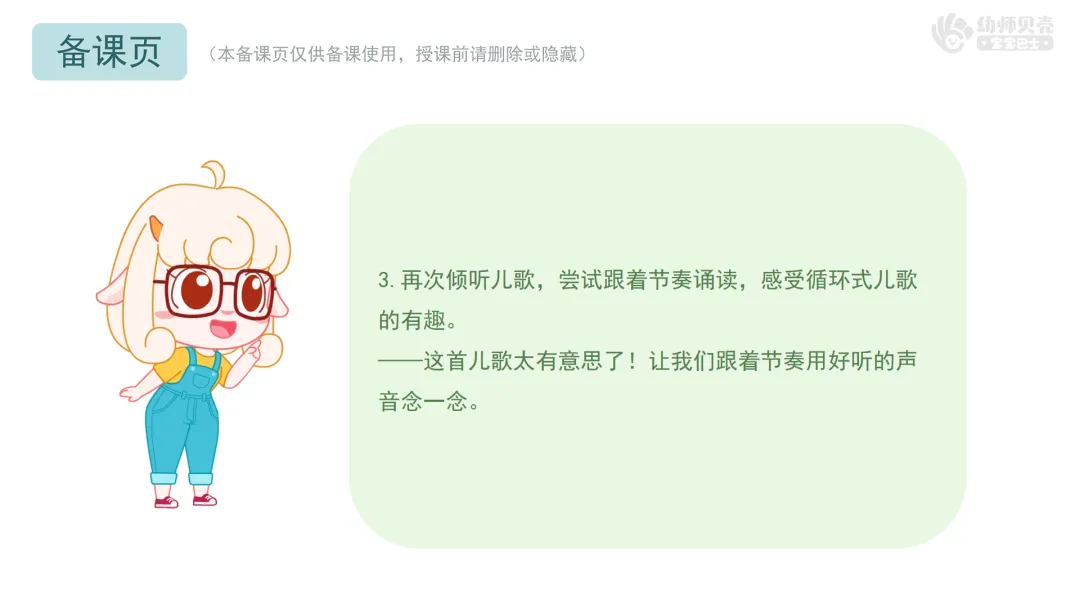 3.再次倾听儿歌,尝试跟着节奏诵读,感受循环式儿歌的有趣。