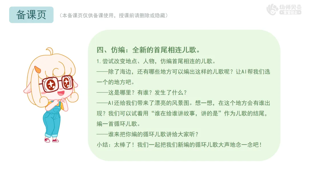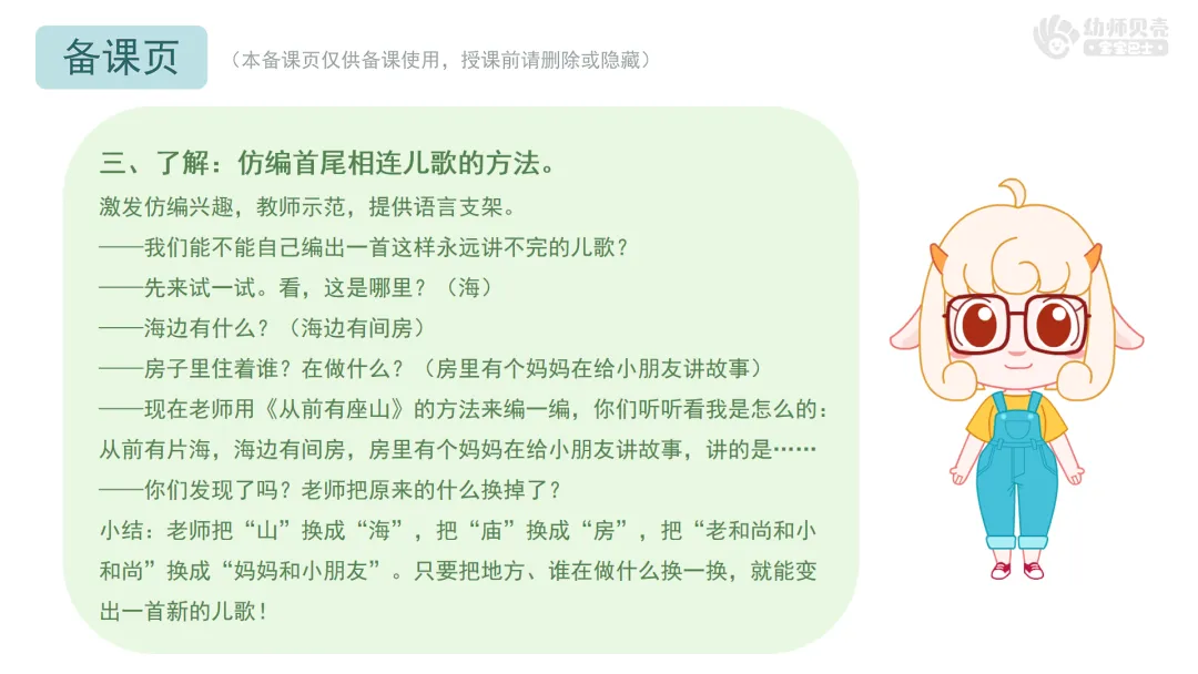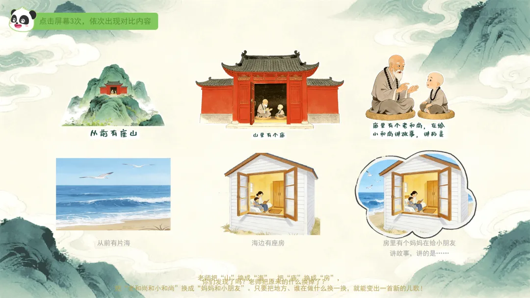 小结:老师把“山”换成“海”,把“庙”换成“房”,把“老和尚和小和尚”换成“妈妈和小朋友”。只要把地方、谁在做什么换一换,就能变出一首新的儿歌!