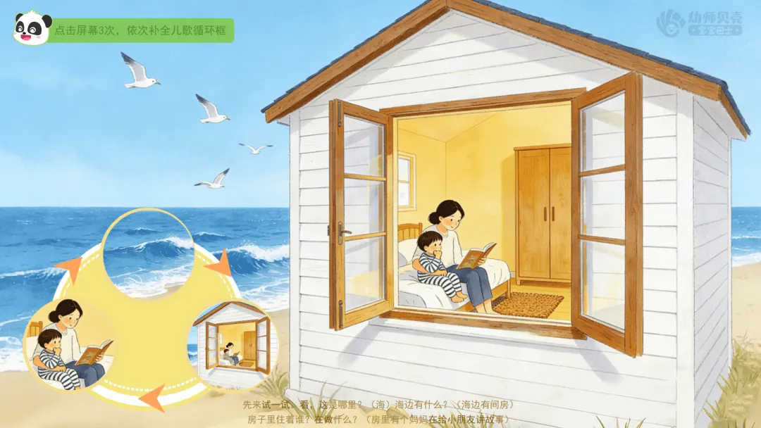 ——房子里住着谁?在做什么?(房里有个妈妈在给小朋友讲故事)