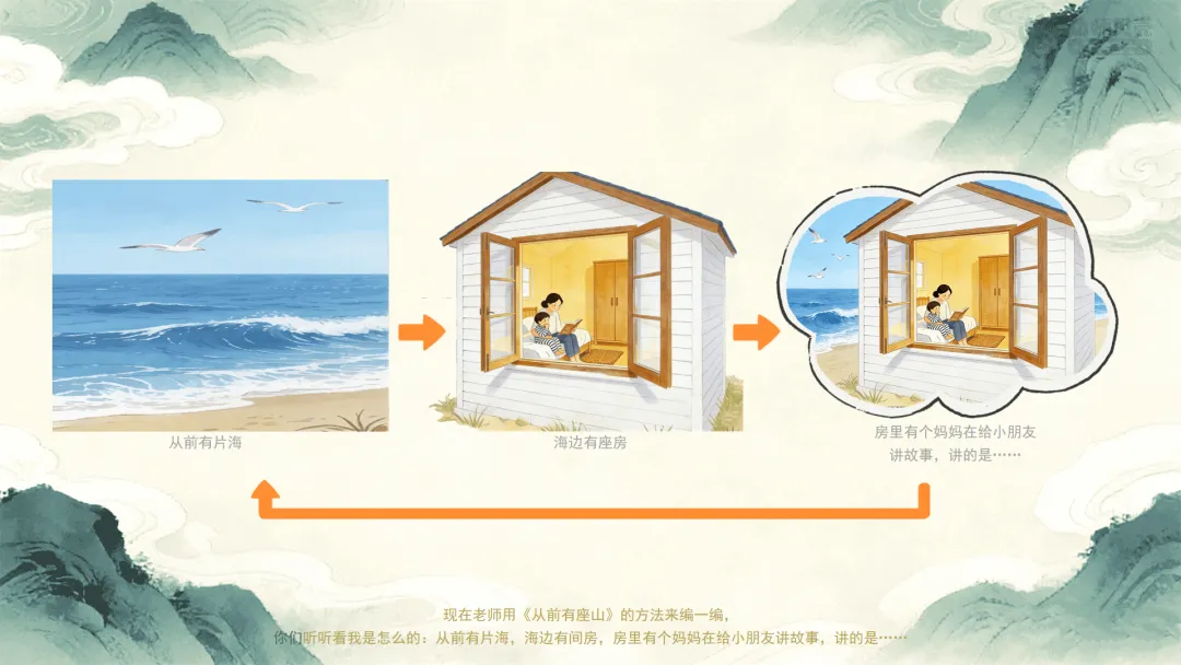 ——现在老师用《从前有座山》的方法来编一编,你们听听看我是怎么的:从前有片海,海边有间房,房里有个妈妈在给小朋友讲故事,讲的是……