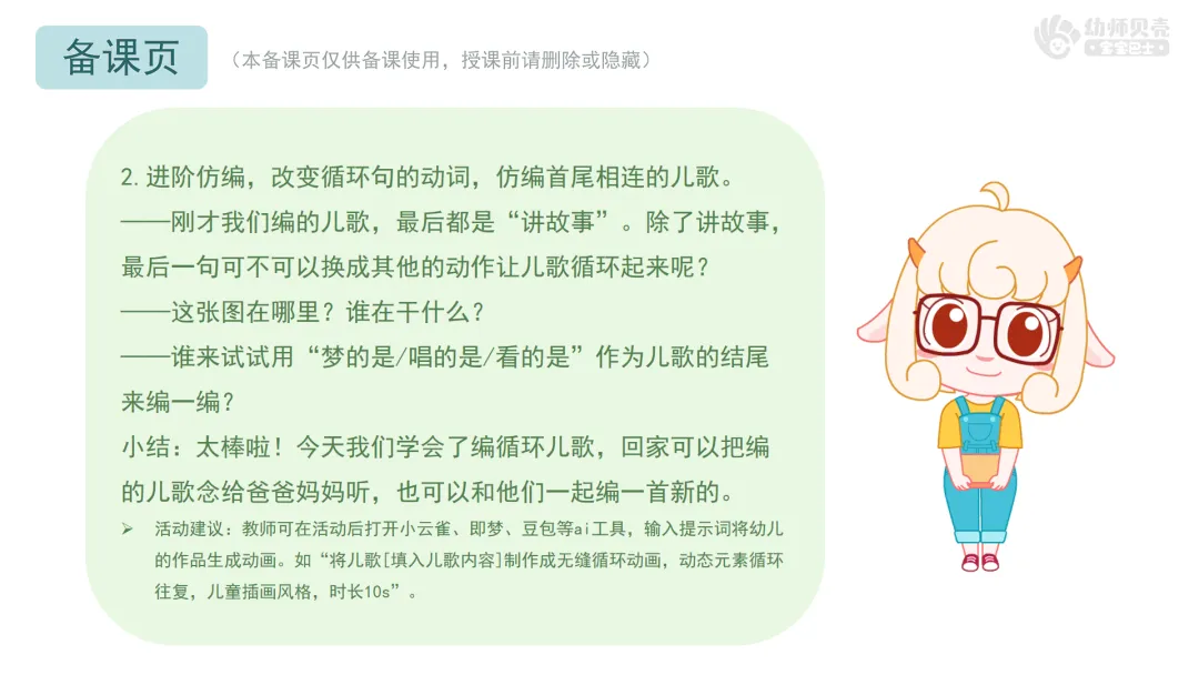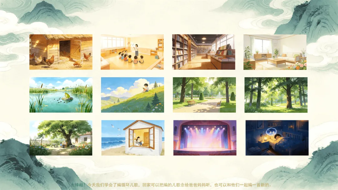 Ø活动建议:教师可在活动后打开小云雀、即梦、豆包等ai工具,输入提示词将幼儿的作品生成动画。如“将儿歌[填入儿歌内容]制作成无缝循环动画,动态元素循环往复,儿童插画风格,时长10s”。