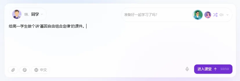 我当时半信半疑,在对话框里敲了一行字:“给高一学生做个讲‘基因自由组合定律’的课件。”
