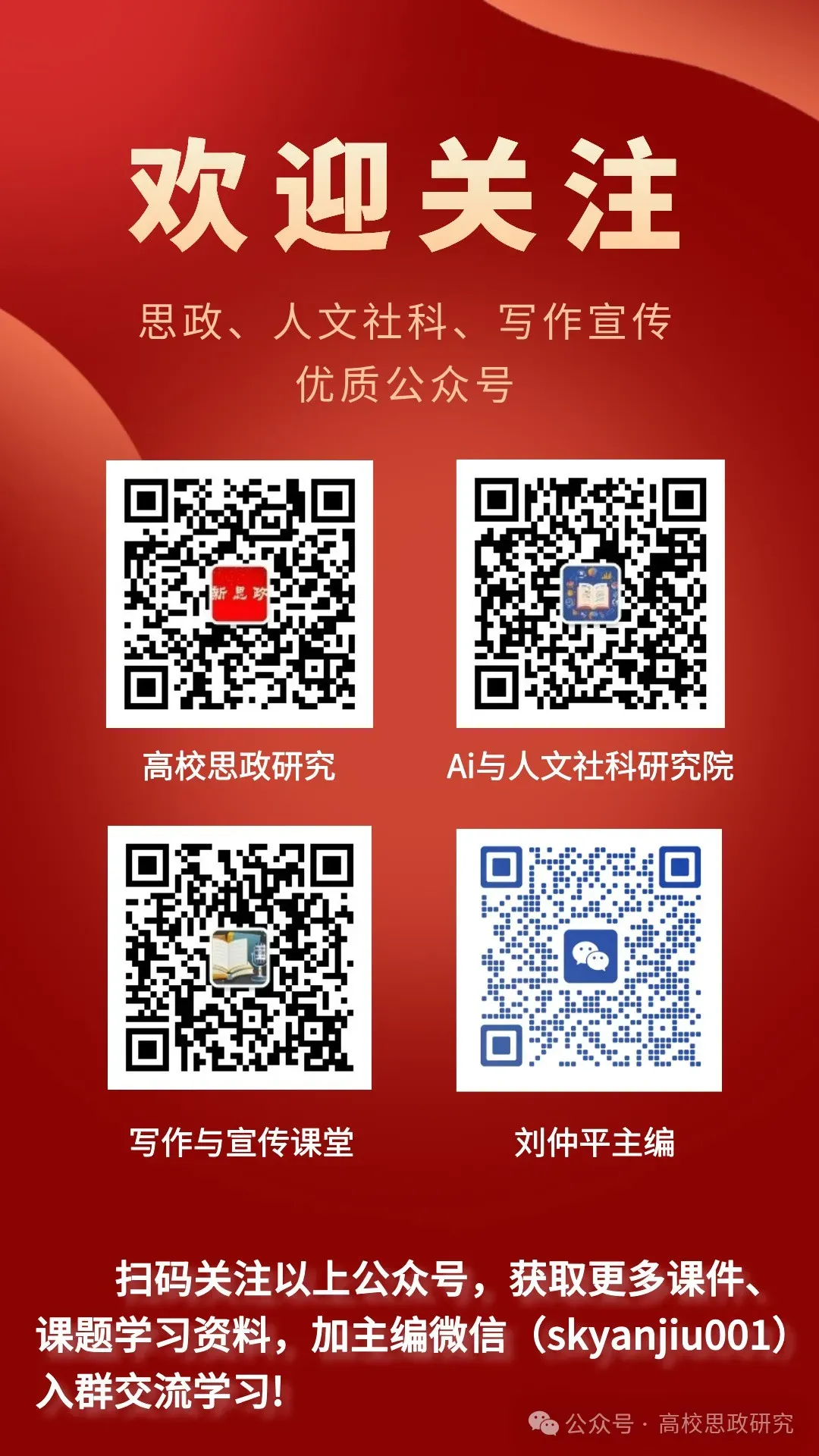 研究院开设有“论文写作与发表交流群”、“课题申报与写作交流群“、“AI与论文写作、课题申报辅助交流群“、“高校马院院长交流群”“思政专家学者交流群”“党校校长交流群”“高校宣传部长交流群”“马理论期刊编辑交流群”“思政者之家教师交流群”“思政者之家学生交流群”“党校教师交流群”,加主编微信(skyanjiu001)入群交流学习!