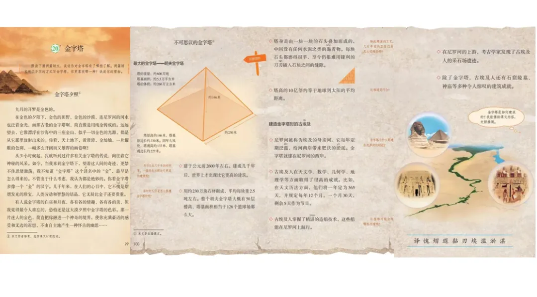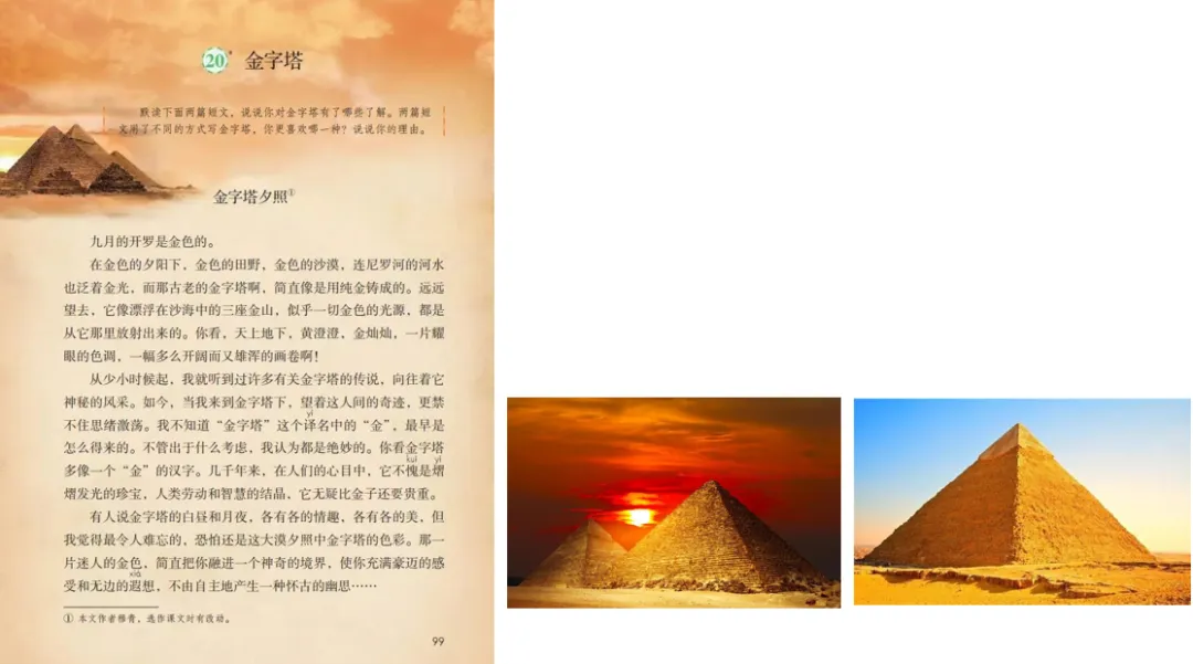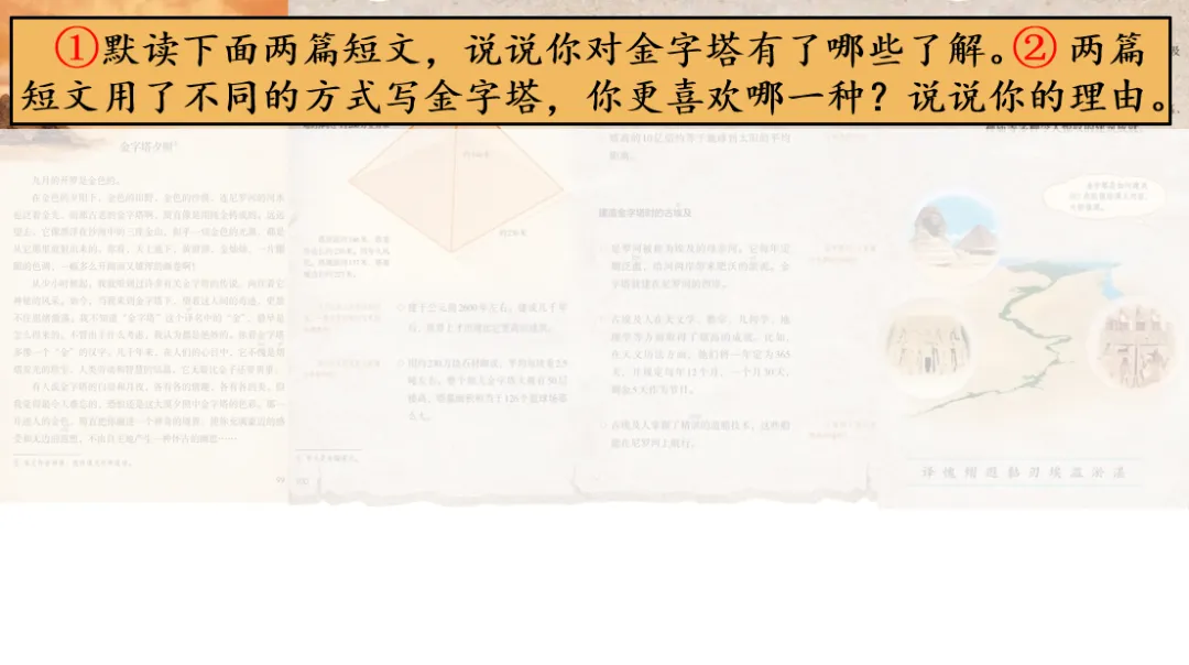 生:默读下面两篇短文,说你对金字塔有了哪些了解?两篇短文用了不同的方式写金字塔,你更喜欢哪一种?说说你的理由。