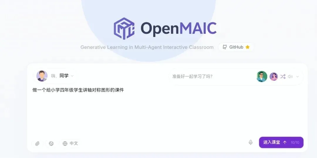 最近刷到个新玩意儿--Open MAIC,清华出品,必属精品。官网地址:https://open.maic.chat/。打开后界面清爽干净。