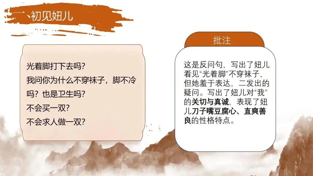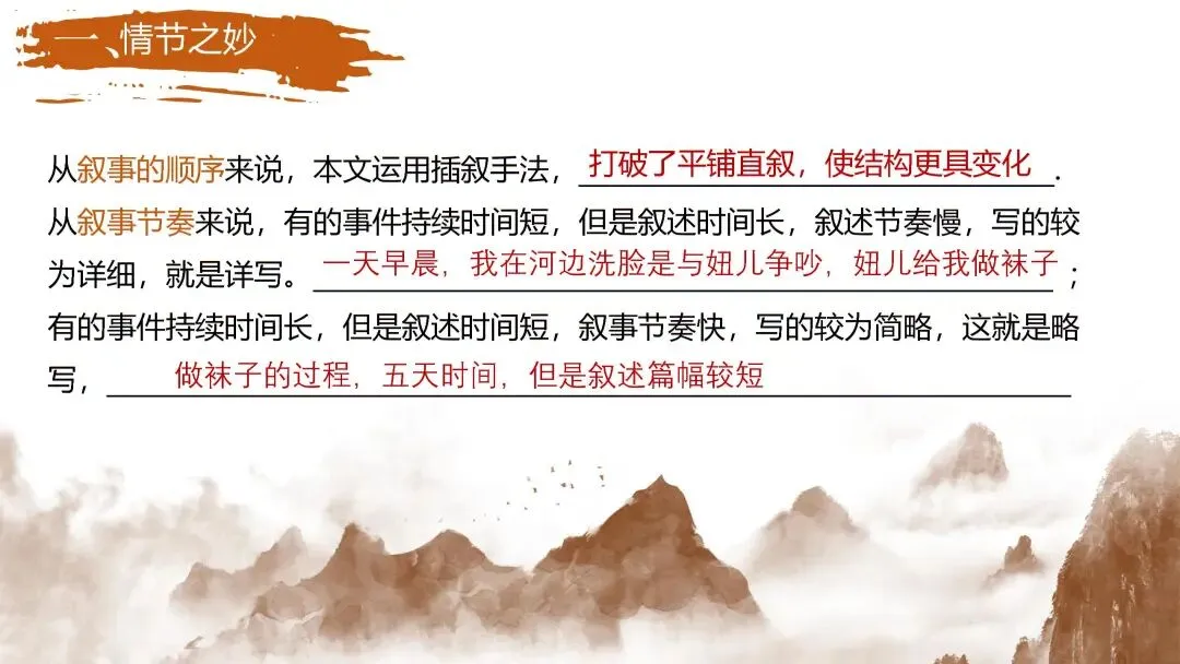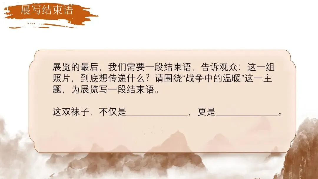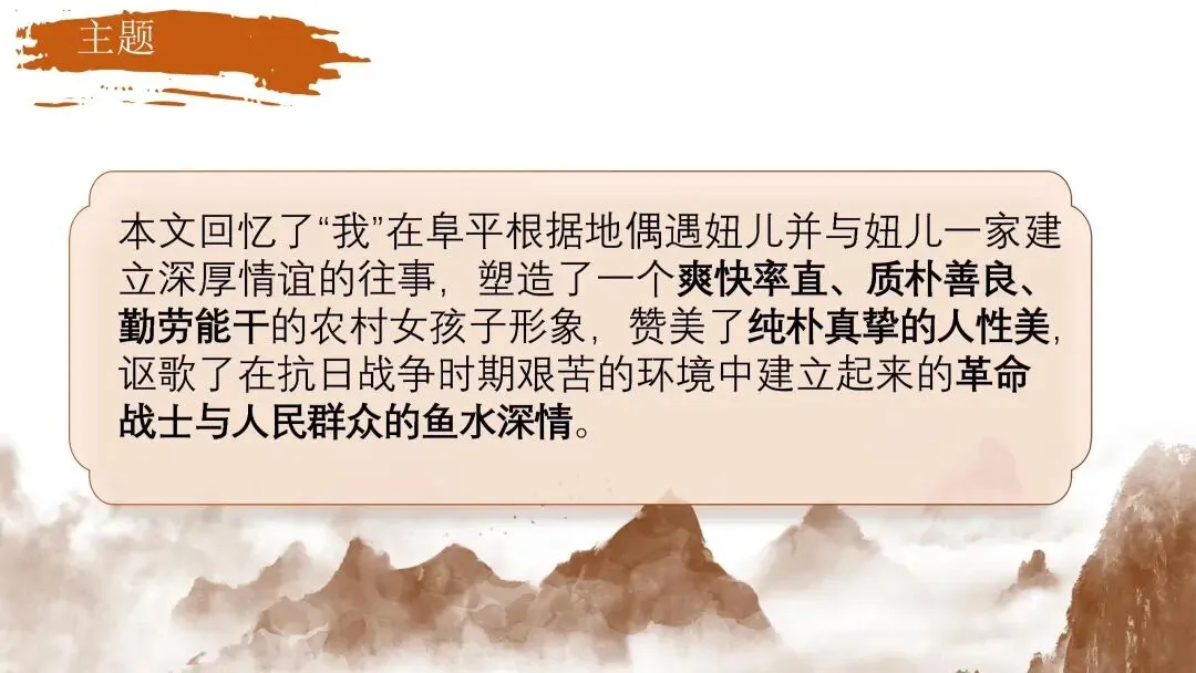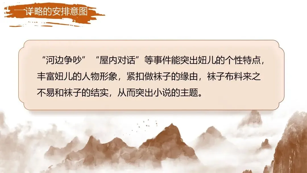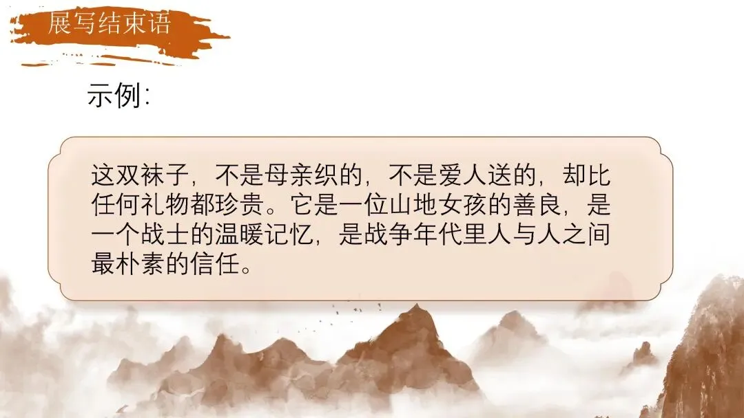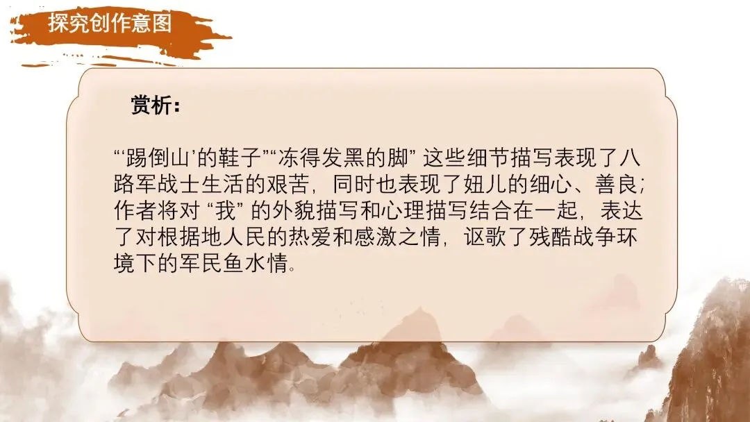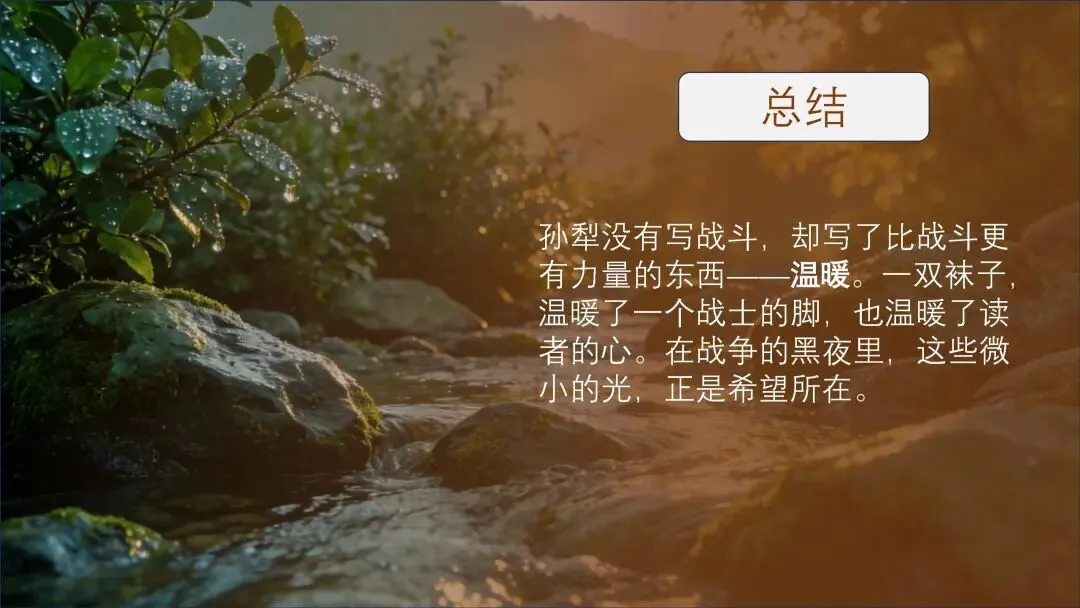 1.知识与能力:理清小说以“袜子”为线索的叙事脉络,掌握人物形象分析方法,理解白描、细节描写的表达效果,品味孙犁散文式小说清新质朴的语言特色。2. 过程与方法:通过朗读、圈点批注与小组讨论,抓住关键语句赏析人物,学习以小见大的写作手法,提升小说阅读与鉴赏能力。3. 情感态度与价值观:感受抗战时期艰苦环境中军民之间真挚淳朴的情谊,体会劳动人民善良、乐观、坚韧的品质,培养对普通劳动者的尊重与感恩之心。选取文中“做袜子”“送袜子”等经典片段,改编成150字左右微型剧本,加入人物对话、动作和简单场景提示,再现军民温情瞬间。
