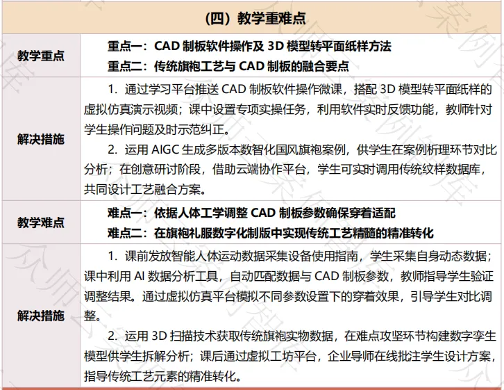教学重点的设定通常依据专业标准和行业标准,选自“知识目标”的“掌握”点。教学难点通常根据学情分析、教学经验来设定,一般取自“解决重点”中最难的步骤。教学重难点确定后,需要介绍相应的解决措施,通常要体现出信息技术手段和资源如何有效解决教学重难点。