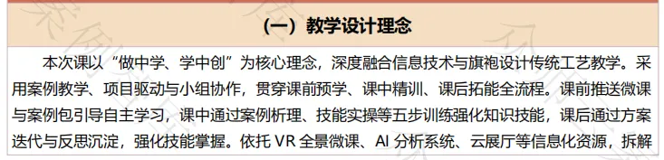 教学设计理念部分通常要阐述教学理念、教学模式、课前课中课后的教学活动、课程思政融合、评价方式、教学目标实现等内容,需要插入图表辅助说明。