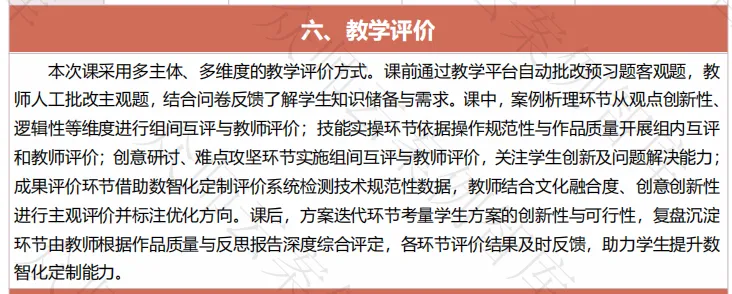 教学评价要着重体现过程性评价体系,注重评价主体的多元化,评价要素多方面,评价构成多角度等。在过程性评价中,学生、教师、企业导师都是评价主体,评价的信息包含线上线下两个角度,既有平台测试成绩也有线下的实操打分。可以按课前、课中和课后三阶段来介绍评价方法,配图表辅助说明。
