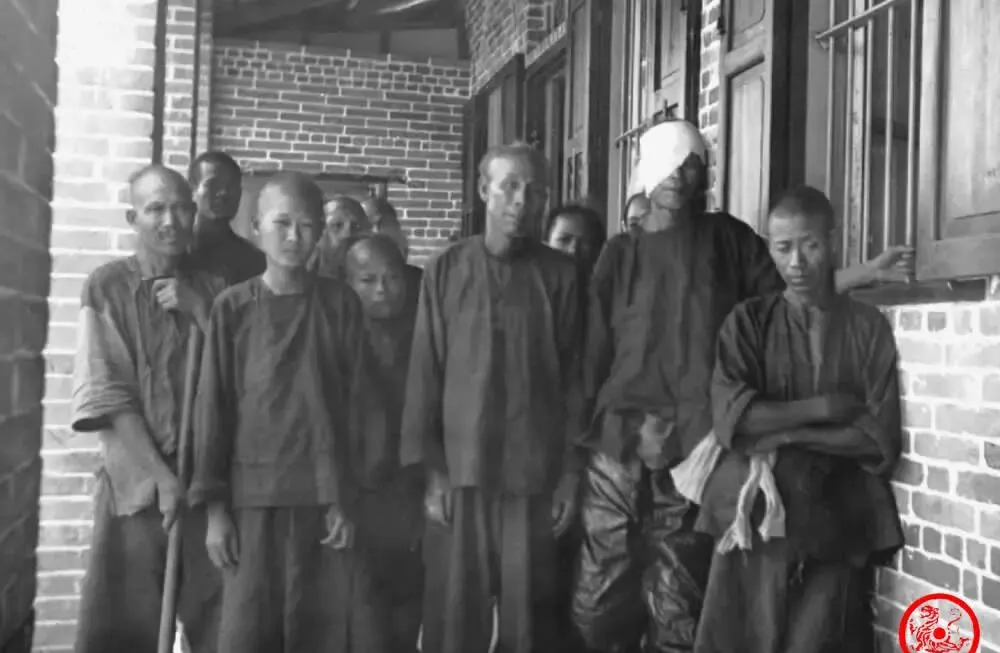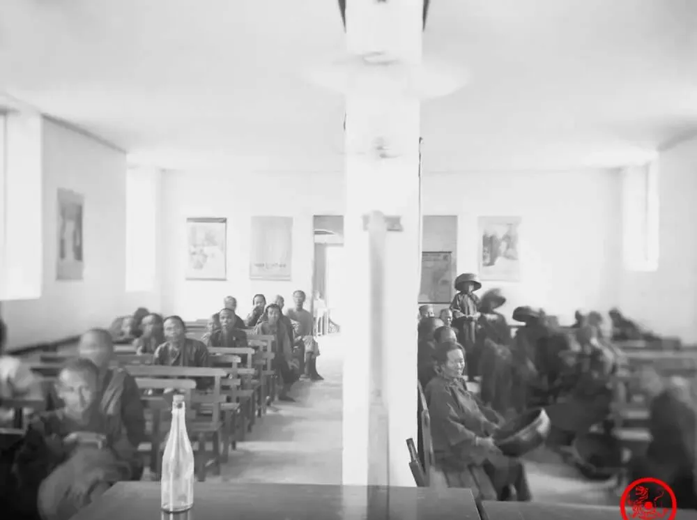 这个屋子一分为二,左边坐的是女病人,右边一排是男病人,墙壁刷得干净,靠墙悬挂几幅画,光线没遮掩,屋里安静地等着,有一两个孩子,帽子坐得规矩,前排一位老太太端着碗,不知是拿来兑药喝还是顺手带着的,过去看病不比现在,诊室隔着厚帘布,男女有别,头上顶着檐灯,空气里估计还有点药水味。