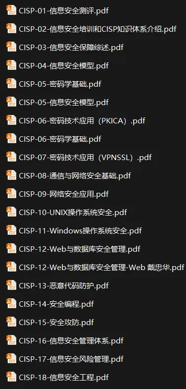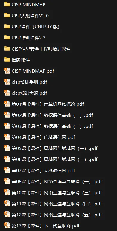 这份资料堪称CISP备考界的“百科全书”,涵盖了从大纲、思维导图到详细课件的所有版本。无论你是喜欢看最新的V3.0大纲,还是习惯CNITSEC版的经典课件,亦或是需要详细的网络技术基础补充(如计算机网络、数据通信、广域网、局域网、无线通信、网络互连与下一代互联网等),这里应有尽有,助你全方位、多角度攻克CISP认证!