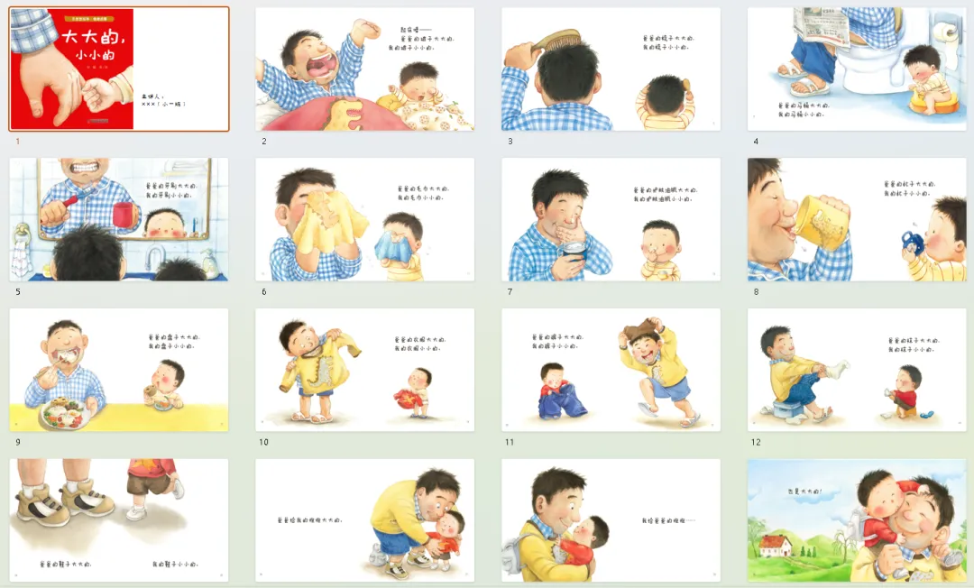 绘本以简洁的文字和生动的图画,描绘了一个充满爱与温馨的家庭场景,通过爸爸和宝宝在日常生活中所用物品的大小对比,不仅让孩子们认知了生活物品,还让他们感受到了浓浓的父子情。