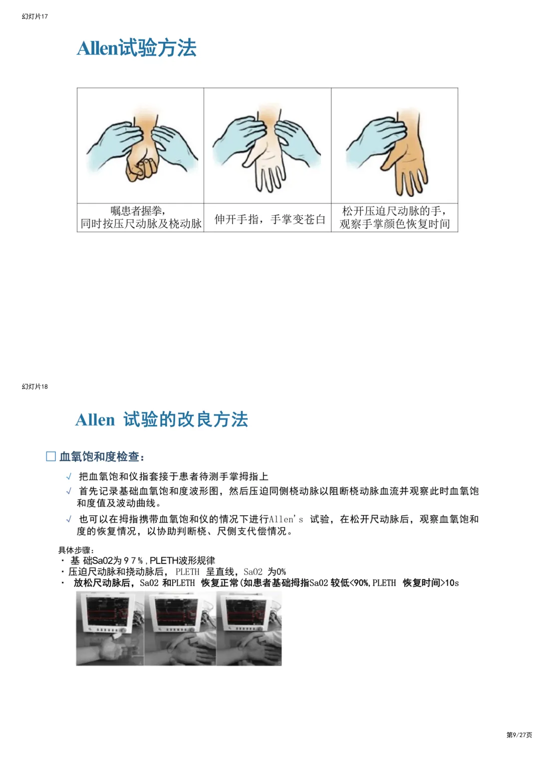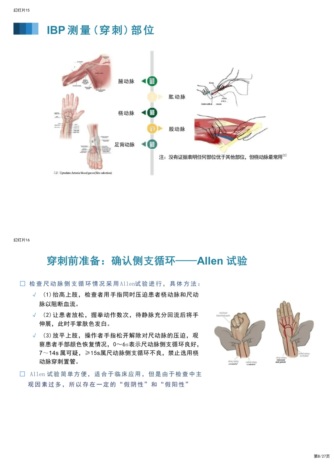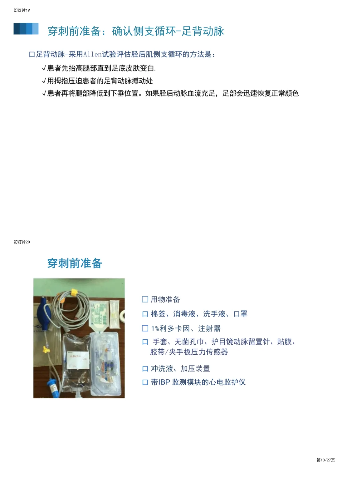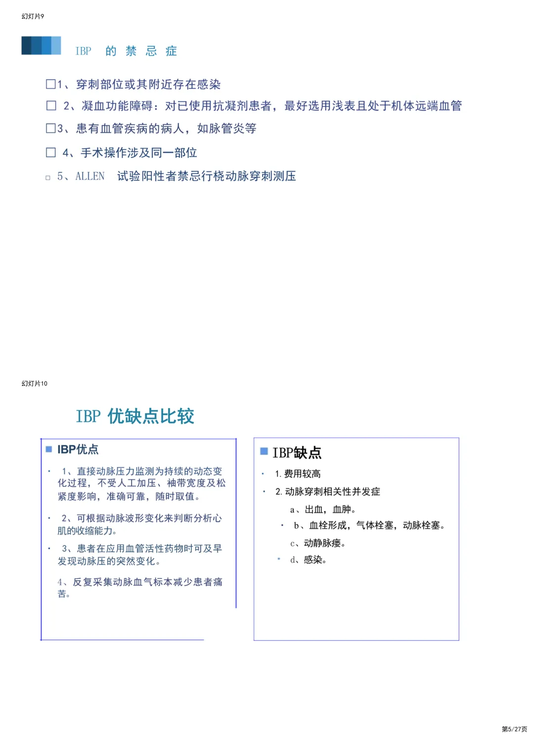 下周又要轮到你在科室做业务学习汇报了,选题是"有创动脉血压监测(IBP)"。 是不是对着空白文档发愁?网上的资料要么是密密麻麻的文字,根本没法放上去讲;要么波形图模糊不清,讲到"异常波形"时自己都解释不明白,生怕被主任和实习生问住? 临床工作已经忙得脚不沾地,真的没精力去抠每一个图表和排版。 别急,我懂你的痛。为了帮大家从繁琐的"做PPT"中解放出来,我特意整理了这份逻辑清晰、内容硬核的成品PPT。你不需要再从零开始,拿回去改个名字就能用! 这份PPT之所以能让你在科室汇报中脱颖而出,是因为它完美解决了三个临床教学中最头疼的问题: 一、 把"天书"般的波形,变成了"看图说话"的连环画 IBP最核心的是看懂波形,但教科书上光讲理论,护士们听完还是不会看。 这份PPT里,我特意做了一组"正常与异常波形对比图",简直是把复杂的病理生理机制"画"出来了。 • 正常波形的"三部曲":它清晰地标注了收缩期(左心室射血)、重搏切迹(主动脉瓣关闭)和舒张期,让你一眼就能看出心脏工作的节奏。 • 异常波形的"报警器":PPT里详细列出了"迟脉"(主动脉瓣狭窄)、"二重脉"(主动脉瓣关闭不全)以及"尖顶圆穹型"(肥厚型心肌病)的波形。 - 临床干货:比如主动脉瓣关闭不全的波形,PPT里直接画出了"上升支陡峭、舒张压低"的特征,并配文解释:"这是因为血液舒张期反流回心室"。 - 这种视觉化的教学,比你干巴巴念十分钟定义都管用。 二、 穿刺前的"安检"与操作细节,一张图全搞定 讲到操作,大家最怕的是并发症。这份PPT在"穿刺准备"环节,用一张高清流程图把Allen试验讲得明明白白。 • 侧支循环评估:很多人做Allen试验容易漏步骤,PPT里用分步图解展示了从"抬高上肢"到"压迫桡/尺动脉",再到"观察手掌颜色恢复"的全过程。 • 改良方法:考虑到传统Allen试验有主观性,PPT还补充了"血氧饱和度法"的改良操作图,这是很多老护士都不知道的实用技巧。 • 进针角度:PPT中有一张经典的"经皮桡动脉穿刺示意图",清晰展示了30°-45°的进针角度和"见回血后推针"的操作要点。 三、 护理要点:从"防堵管"到"防感染"的实操清单 最后讲护理,最怕讲成流水账。这份PPT把护理要点做成了"红绿灯"式的清单,直接告诉你怎么做才不踩雷。 1. 防血栓的"300mmHg法则":PPT里特别强调了加压气袋必须维持在300mmHg,并解释了原理——只有这个压力才能保证持续冲洗,对抗血液回流。 2. 零点校正的"黄金法则":很多人校零就错了。PPT用一张定位图强调:传感器必须与腋中线(右心房)同水平。位置每差5cm,血压值可能就差3-4mmHg。 3. 拔管指征:PPT最后总结了"远端缺血"的监护要点,特别是对于使用抗凝剂的患者,如何判断是否该拔管,都有明确的图示指引。与其自己熬夜找素材、抠排版,不如直接站在巨人的肩膀上,拿回去改个科室名字就能用!下载获取完整版PPT,请点击~