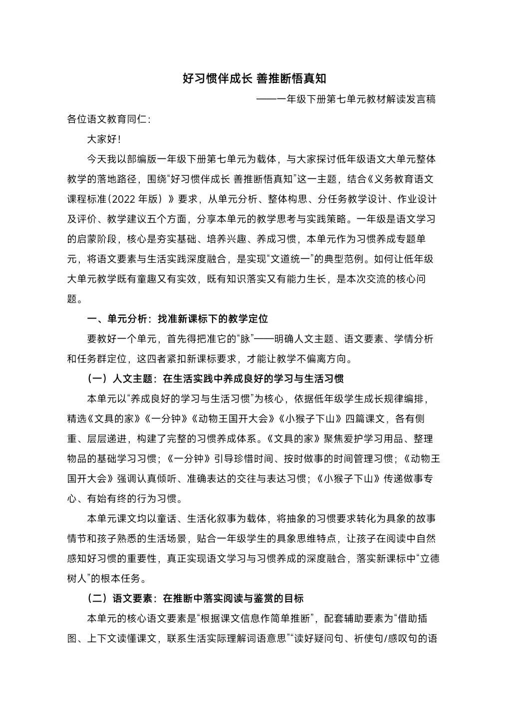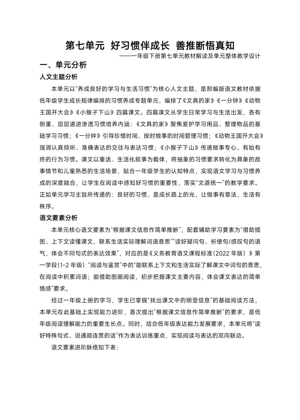>[单元解读]一年级下册语文第七单元解读课件+大单元教学设计+发言稿