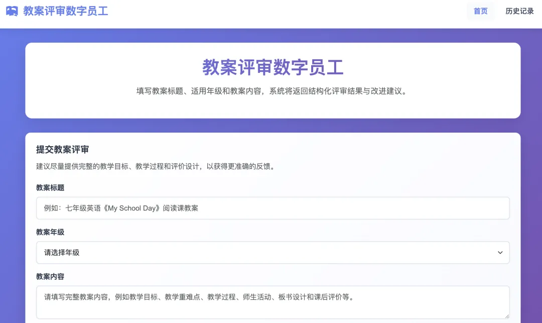 智能教案评审数字员工 — 让每一份教案都被专业对待,让每一位教师都能快速成长,让智慧教研真正落地每一所学校。