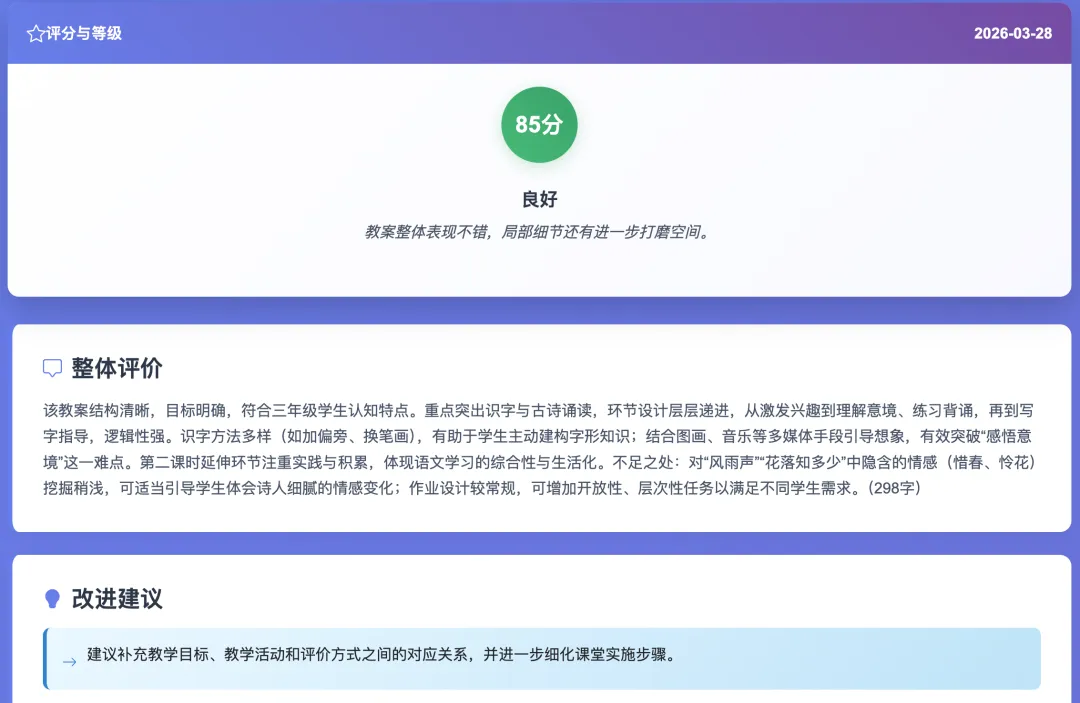 AI模拟资深教研员的评审逻辑,从5大核心维度对教案进行全面审核,不遗漏任何细节:规范性评审:检查教案格式、排版、要素完整性,排查错别字、语病;课标契合度评审:对标新课标,判断教学目标、重难点是否符合学段要求;教学逻辑性评审:分析教学流程、师生互动、教学方法是否合理适配学情;创新性评审:评估是否融入信息化手段、分层作业、个性化教学设计;合规性评审:检查是否符合教育政策、融入思政元素,贴合素质教育要求。3. 量化打分+专业报告,评改一体更高效