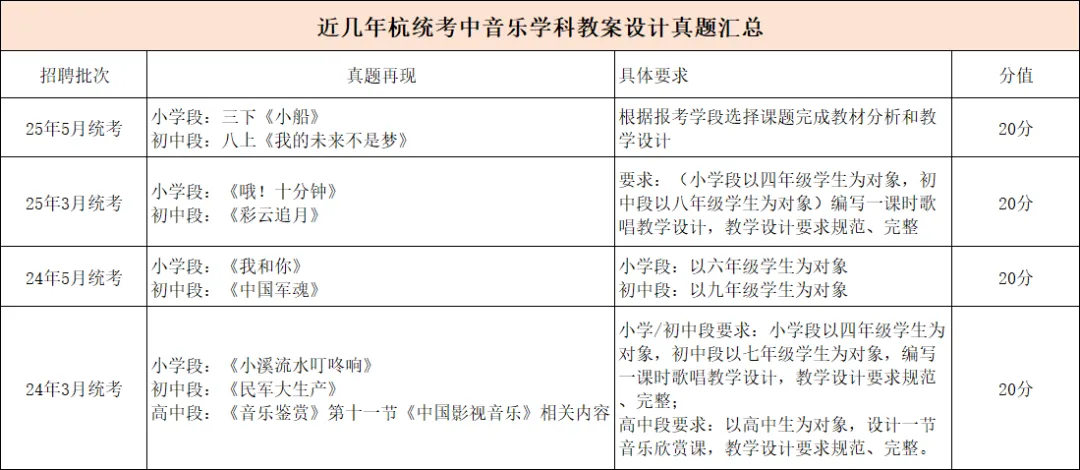 近两年杭统考各批次音乐学科教案设计真题及要求已经整理好了,建议大家在备考过程中重点参考。
