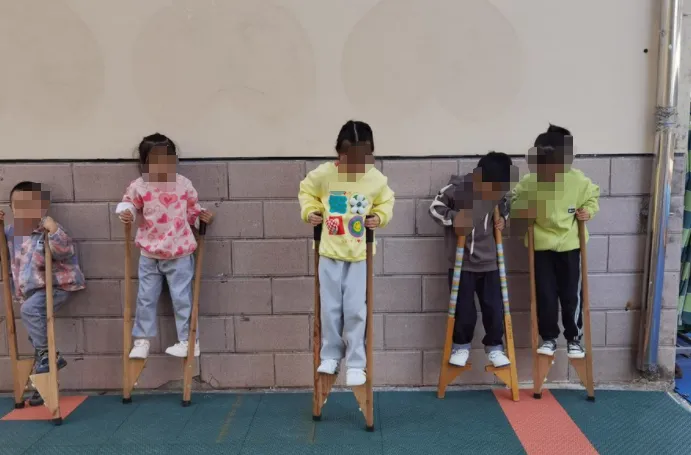 幼儿自由探索高跷的玩法,可以自己玩,也可以与几个小朋友一块玩,鼓励幼儿想出不同的玩法。创造出高跷的多种玩法,教师还可以请个别幼儿演示,并鼓励其他幼儿尝试这种玩法。