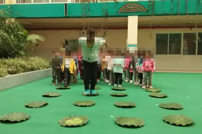 3)把荷叶排成两排,让幼儿在荷叶上连续跳跃过池塘。