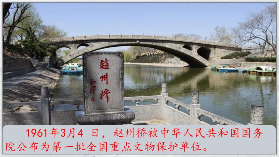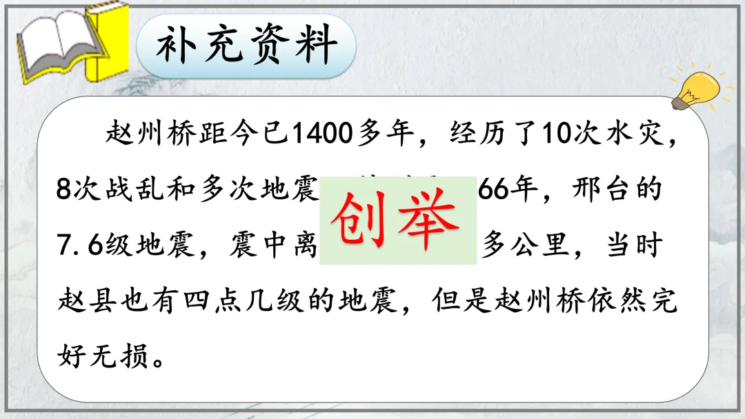 补充资料:赵州桥距今已1400 多年, 经历了10 次水灾,8 次战乱和多次地震,特别是 1966 年,邢台的 7.6 级地震,震中离赵县只有 40 多公里,当时赵县也有 四点几级的地震,但是赵州桥依然完好无损。