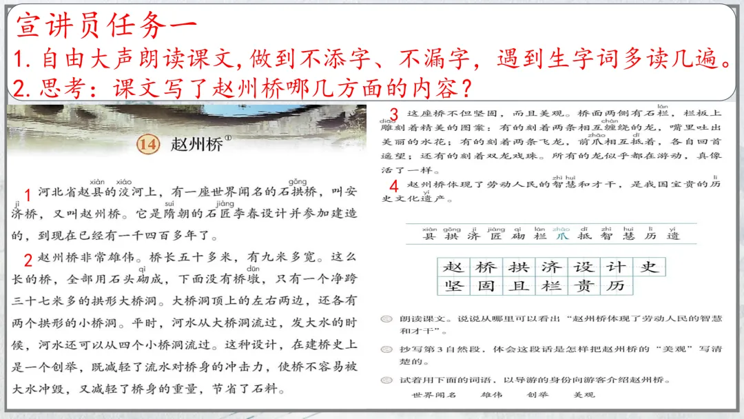 1.同学们,要当好传统文化宣讲员,把内容讲好讲充实,我们要把课文读懂。请同学们自由大声朗读课文, 做到不添字、不漏字,遇到生字词多读几遍。思考:课文写了赵州桥哪几方面的内容?
