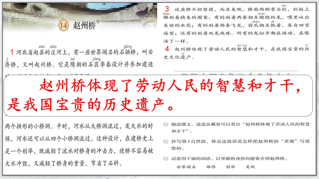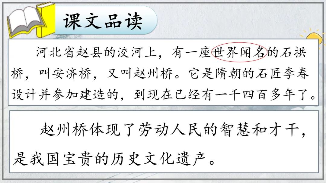 3.默读课文,想想赵州桥为什么这么有名?具体介绍了哪些内容?课文第一自然段就对它作了概述。我们来读读。