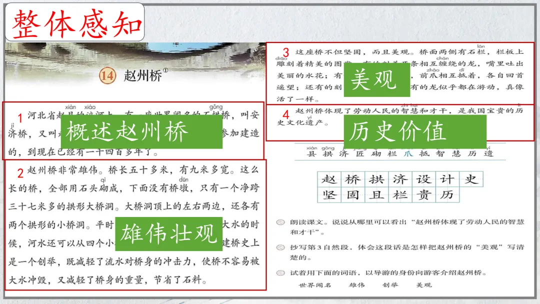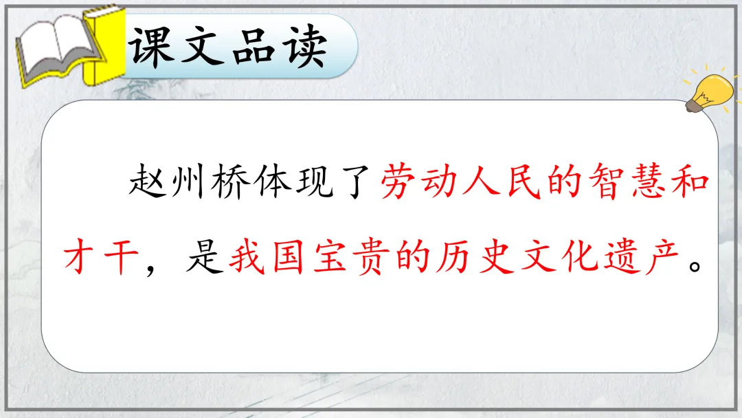 预设:课文第一自然段是整体介绍了赵州桥,最后一个自然段介绍它宝贵的历史,文化遗传。课件出示:概述赵州桥历史价值