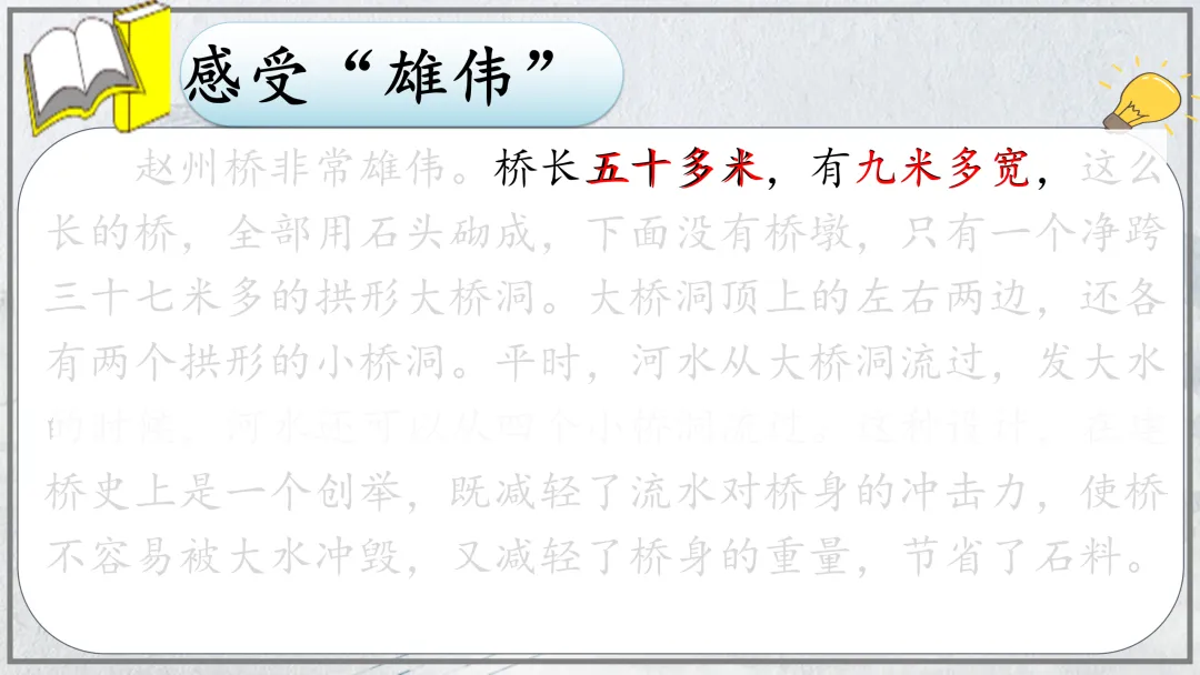 预设:五十多米,九米多宽,用了具体的长度、宽度,就更能说明赵州桥的雄伟。