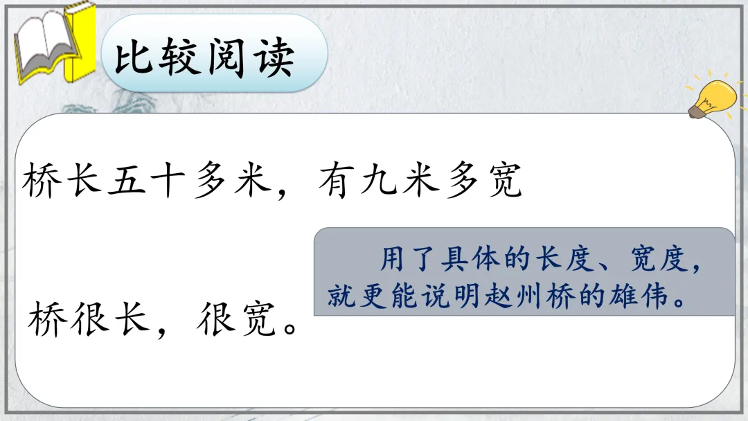 课件出示:用了具体的长度、宽度,就更能说明赵州桥的雄伟。