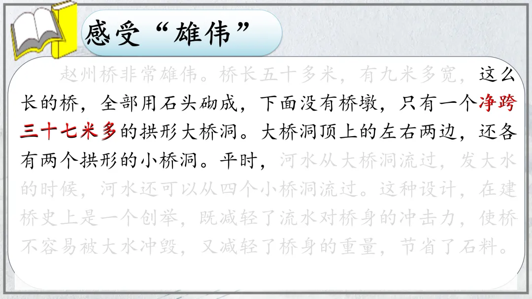 是啊,三十七米多的赵州桥就像一个伟大的巨人净跨在江面上,这是何其雄伟,课件出示:三十七米多