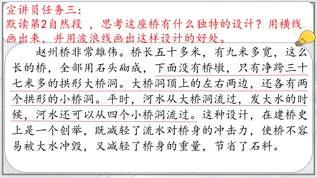 默读第2 自然段 ,思考这座桥有什么独特的设计?用横线画出来,并用波浪线画出这样设计的好处。