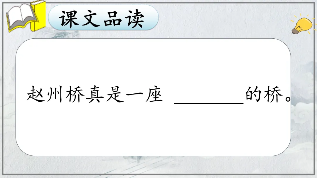 是的,学到这儿,我们不由得赞叹“赵州桥真是一座的桥”。请你说。