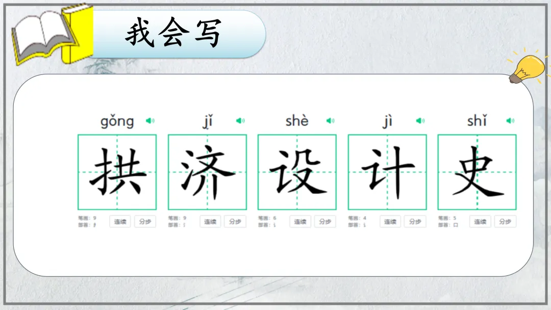 - 会认“县、拱”等12个生字,读准多音字“爪”,会写“赵、1桥、拱、济”等13个字。