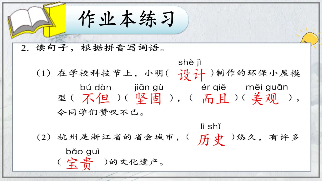 让我们再读一读这几幅精美的画面,相信你能从这些句子中感受到更多。试着完成练习。课件出示:作业本第5题的第1小题