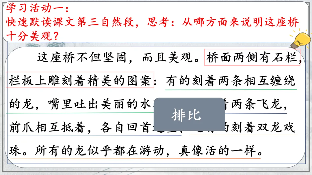 快速默读课文第三自然段,思考:从哪方面来说明这座桥十分美观?