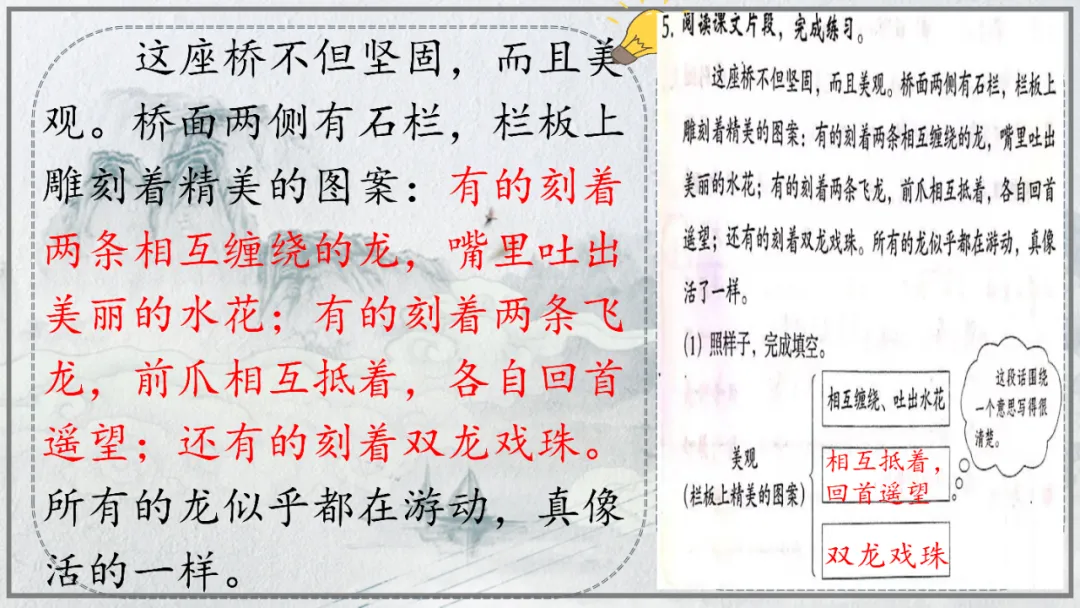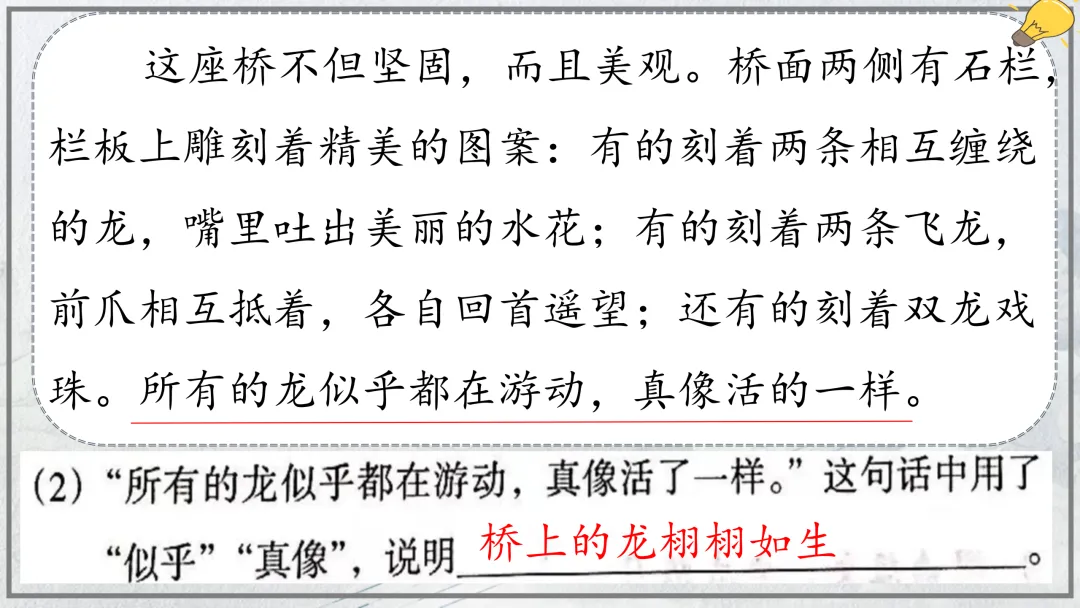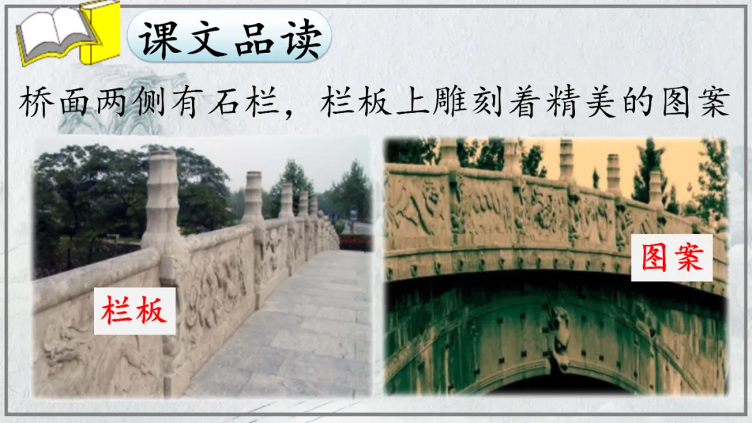 能工巧匠们把龙雕刻活了,作者把石龙写活了,你能把这些文字读活了吗?读一读桥上这些精美的图案。