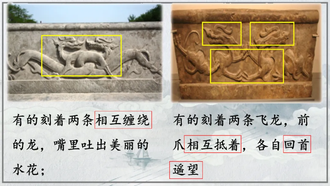 是啊,不仅能雕刻精美的图案,还各式各样的,你们看,他们有的刻着两条相互缠绕的龙,嘴里吐出美丽的水花;请你们对照这个图片说说叫相互缠绕的龙?